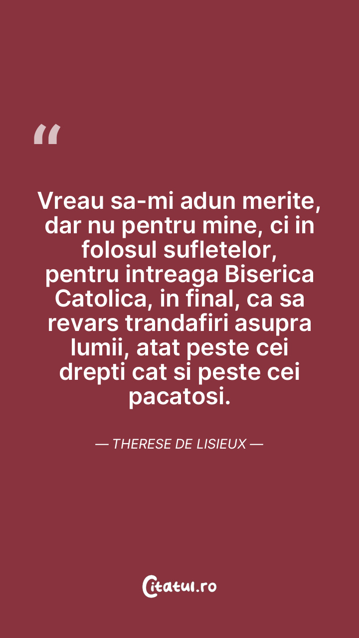 Vreau sa-mi adun merite, dar nu pentru mine, ci in folosul sufletelor, pentru intreaga Biserica Catolica, in final, ca sa revars trandafiri asupra lumii, atat peste cei drepti cat si peste cei pacatosi. Therese de Lisieux