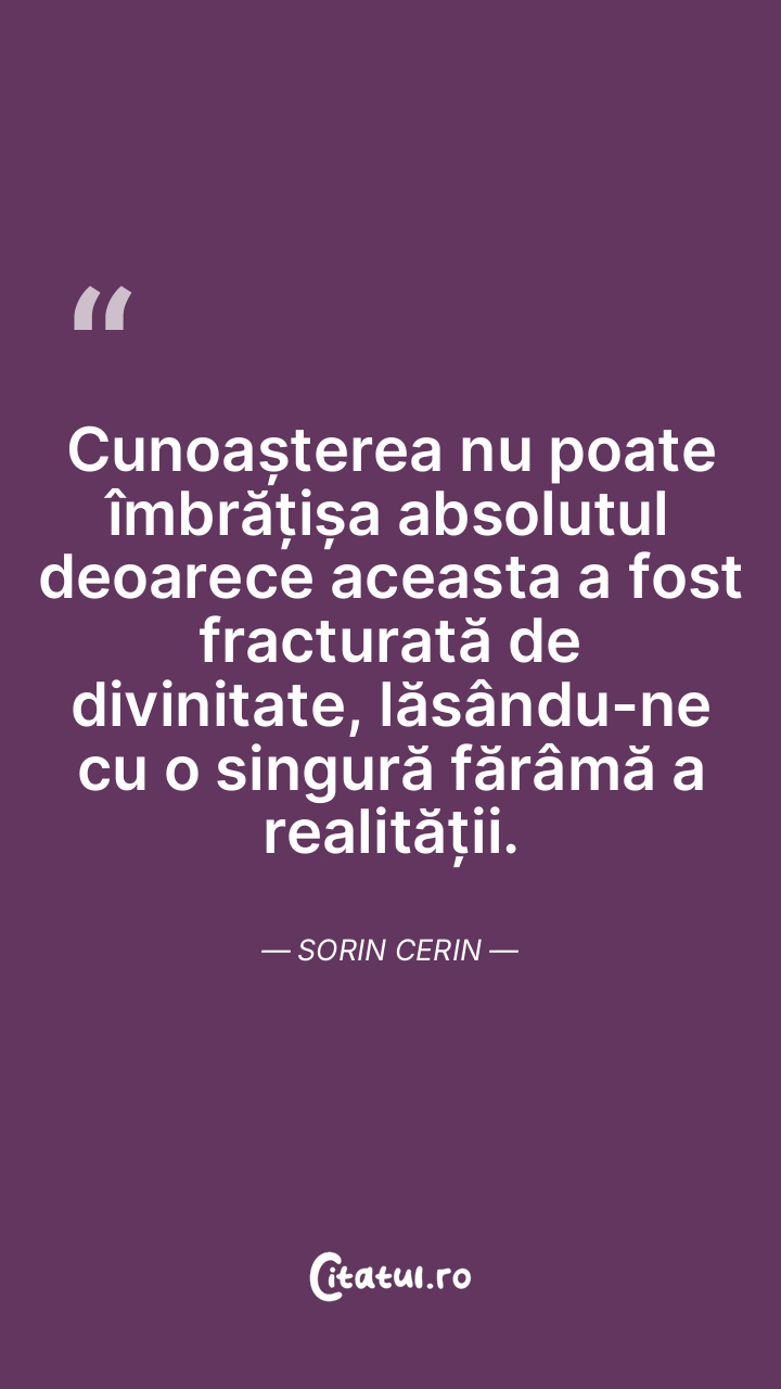 Cunoașterea nu poate îmbrățișa absolutul deoarece aceasta a fost fracturată de divinitate, lăsându-ne cu o singură fărâmă a realității. Sorin Cerin
