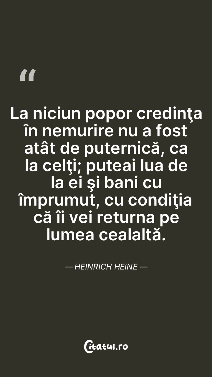 La niciun popor credinţa în nemurire nu a fost atât de puternică, ca la celţi; puteai lua de la ei şi bani cu împrumut, cu condiţia că îi vei returna pe lumea cealaltă. Heinrich Heine
