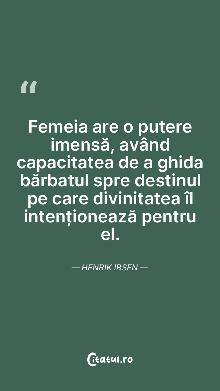 Femeia are o putere imensă, având capacitatea de a ghida bărbatul spre destinul pe care divinitatea îl intenționează pentru el. Henrik Ibsen