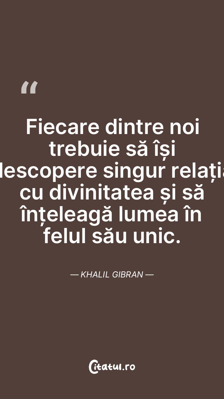 Fiecare dintre noi trebuie să își descopere singur relația cu divinitatea și să înțeleagă lumea în felul său unic. Khalil Gibran