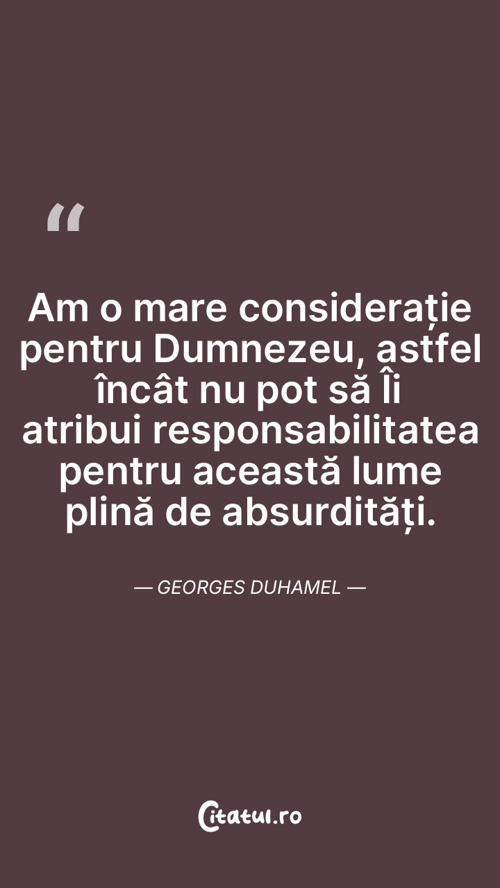 Am o mare considerație pentru Dumnezeu, astfel încât nu pot să Îi atribui responsabilitatea pentru această lume plină de absurdități. Georges Duhamel