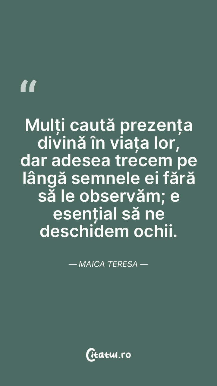 Mulți caută prezența divină în viața lor, dar adesea trecem pe lângă semnele ei fără să le observăm; e esențial să ne deschidem ochii. Maica Teresa