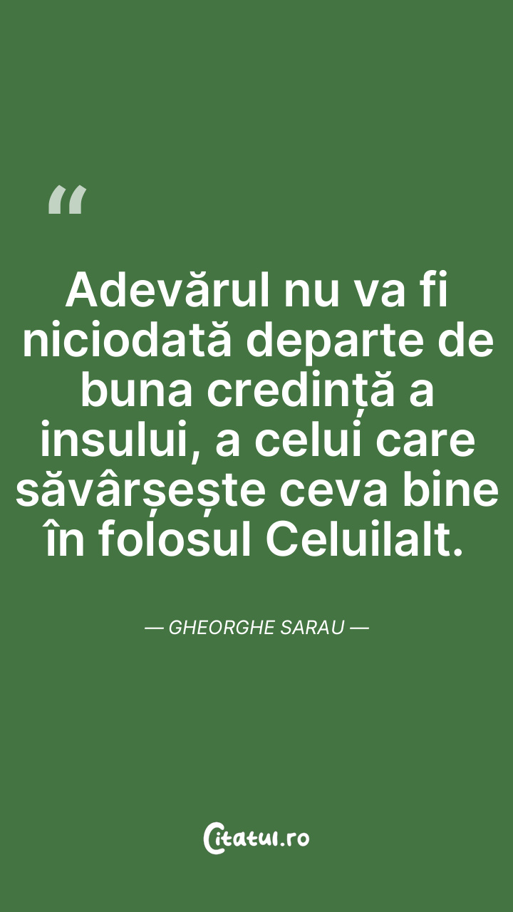 Adevărul nu va fi niciodată departe de buna credință a insului, a celui care săvârșește ceva bine în folosul Celuilalt. Gheorghe Sarau