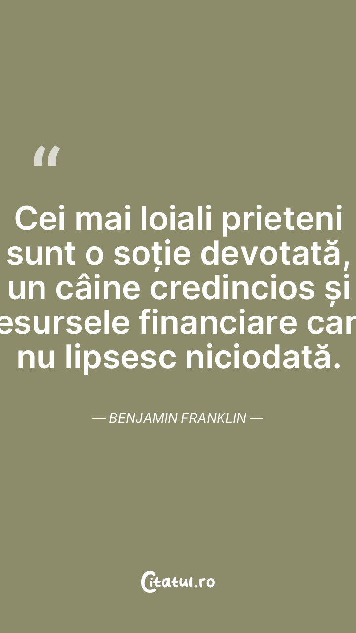 Cei mai loiali prieteni sunt o soție devotată, un câine credincios și resursele financiare care nu lipsesc niciodată. Benjamin Franklin