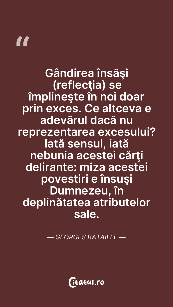 Gândirea însăşi (reflecţia) se împlineşte în noi doar prin exces. Ce altceva e adevărul dacă nu reprezentarea excesului? Iată sensul, iată nebunia acestei cărţi delirante: miza acestei povestiri e însuşi Dumnezeu, în deplinătatea atributelor sale. Georges Bataille