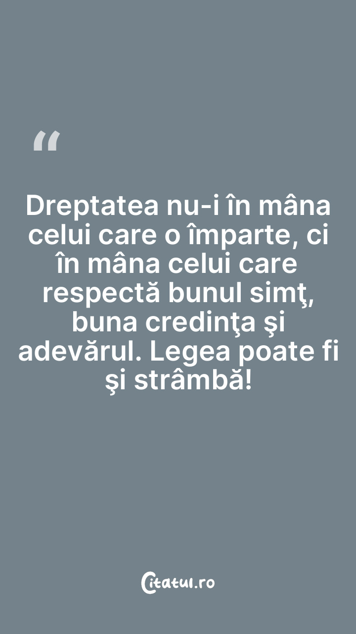 Dreptatea nu-i în mâna celui care o împarte, ci în mâna celui care respectă bunul simţ, buna credinţa şi adevărul. Legea poate fi şi strâmbă!
