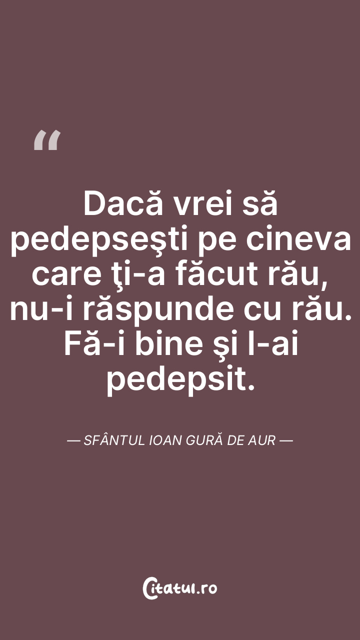 Dacă vrei să pedepseşti pe cineva care ţi-a făcut rău, nu-i răspunde cu rău. Fă-i bine şi l-ai pedepsit. Sfântul Ioan Gură de Aur