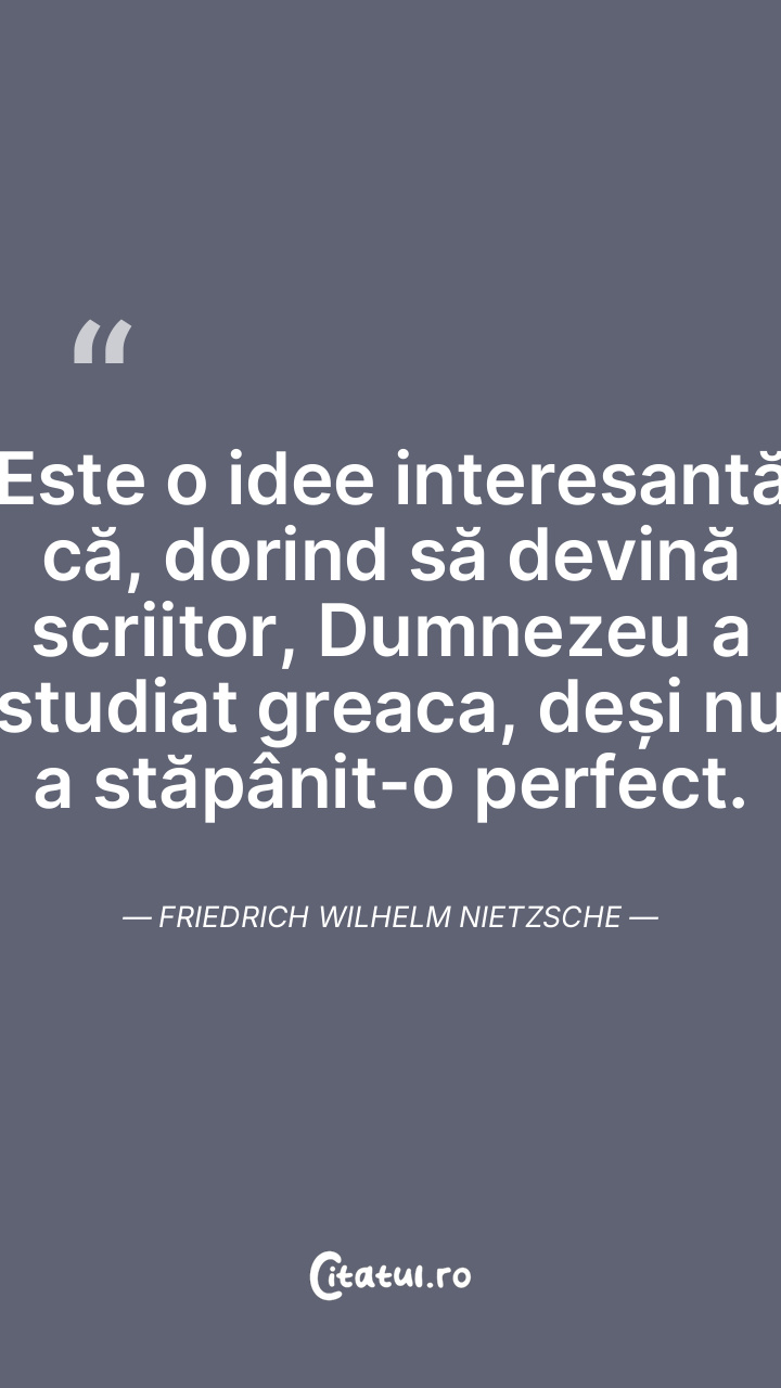 Este o idee interesantă că, dorind să devină scriitor, Dumnezeu a studiat greaca, deși nu a stăpânit-o perfect. Friedrich Wilhelm Nietzsche