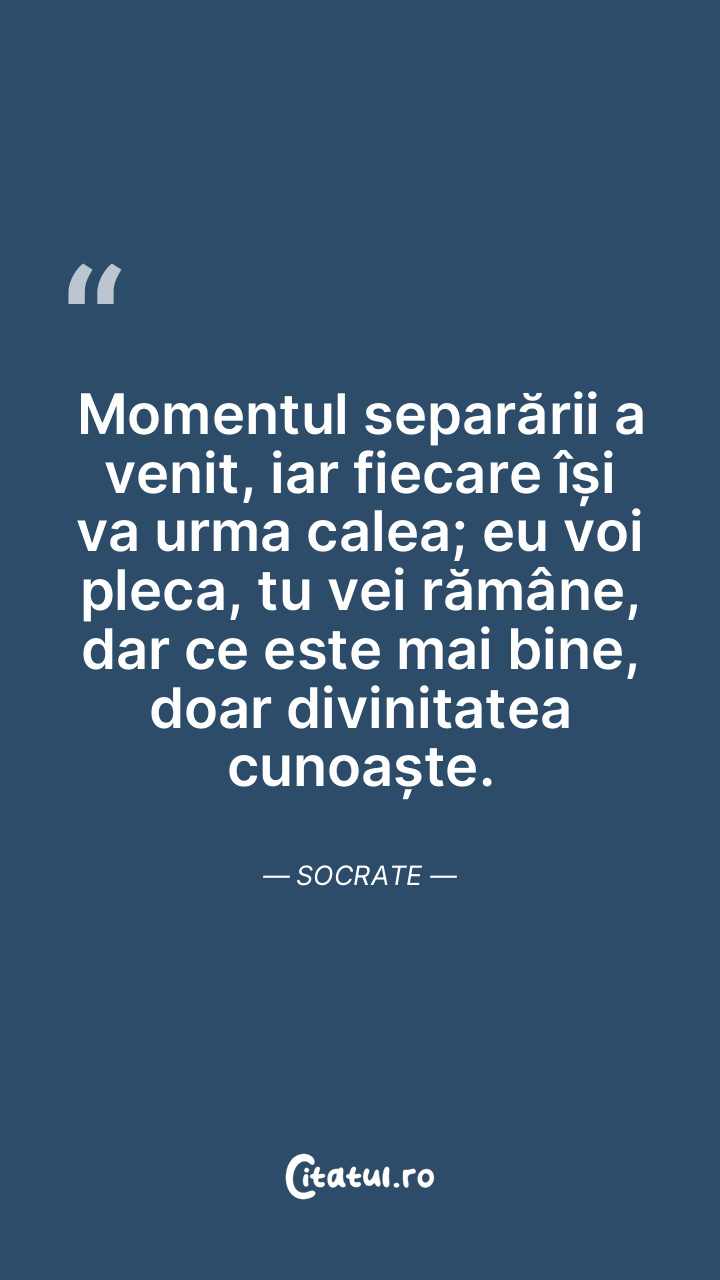 Momentul separării a venit, iar fiecare își va urma calea; eu voi pleca, tu vei rămâne, dar ce este mai bine, doar divinitatea cunoaște. Socrate