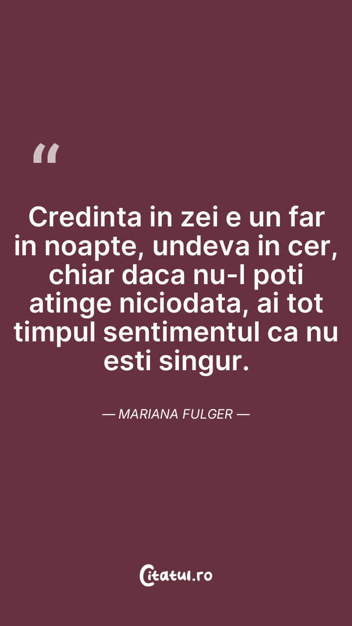 Credinta in zei e un far in noapte, undeva in cer, chiar daca nu-l poti atinge niciodata, ai tot timpul sentimentul ca nu esti singur. Mariana Fulger