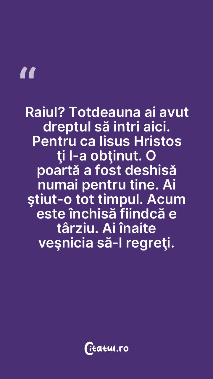 Raiul? Totdeauna ai avut dreptul să intri aici. Pentru ca Iisus Hristos ţi l-a obţinut. O poartă a fost deshisă numai pentru tine. Ai ştiut-o tot timpul. Acum este închisă fiindcă e târziu. Ai înaite veşnicia să-l regreţi.