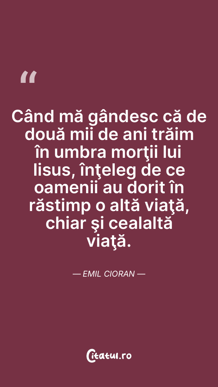 Când mă gândesc că de două mii de ani trăim în umbra morţii lui Iisus, înţeleg de ce oamenii au dorit în răstimp o altă viaţă, chiar şi cealaltă viaţă. Emil Cioran