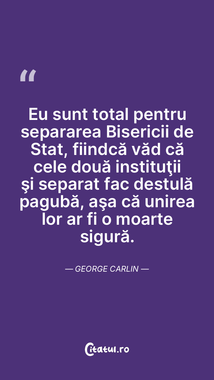 Eu sunt total pentru separarea Bisericii de Stat, fiindcă văd că cele două instituţii şi separat fac destulă pagubă, aşa că unirea lor ar fi o moarte sigură. George Carlin