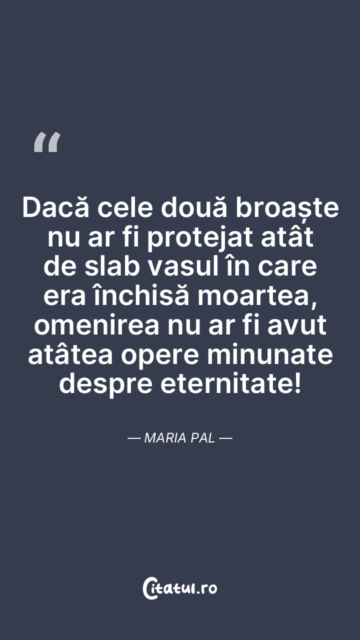 Dacă cele două broaște nu ar fi protejat atât de slab vasul în care era închisă moartea, omenirea nu ar fi avut atâtea opere minunate despre eternitate! Maria Pal