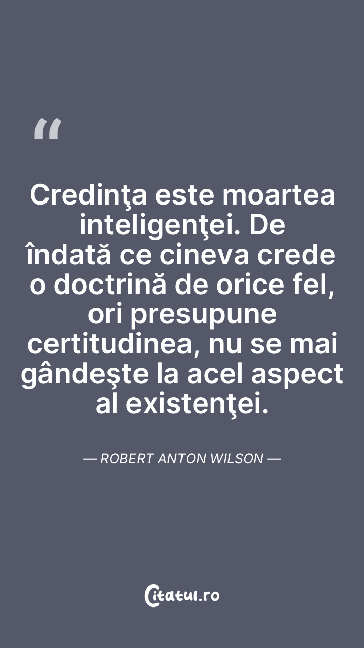 Credinţa este moartea inteligenţei. De îndată ce cineva crede o doctrină de orice fel, ori presupune certitudinea, nu se mai gândeşte la acel aspect al existenţei. Robert Anton Wilson