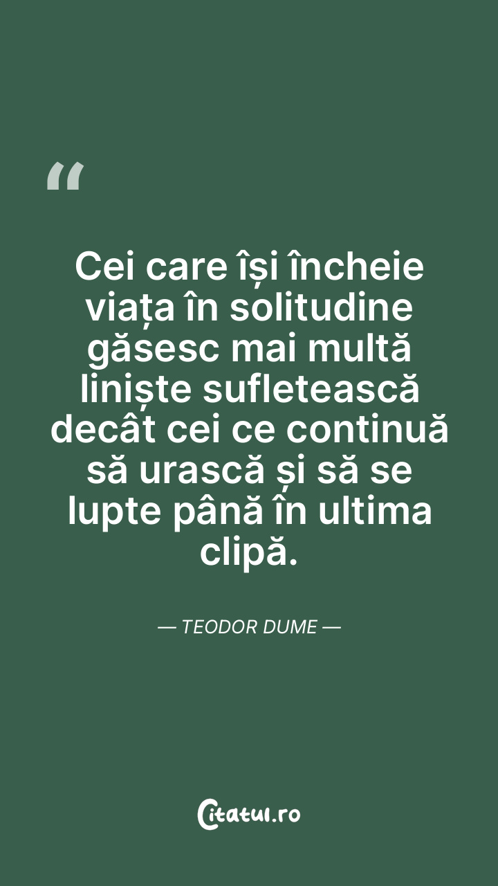 Cei care își încheie viața în solitudine găsesc mai multă liniște sufletească decât cei ce continuă să urască și să se lupte până în ultima clipă. Teodor Dume
