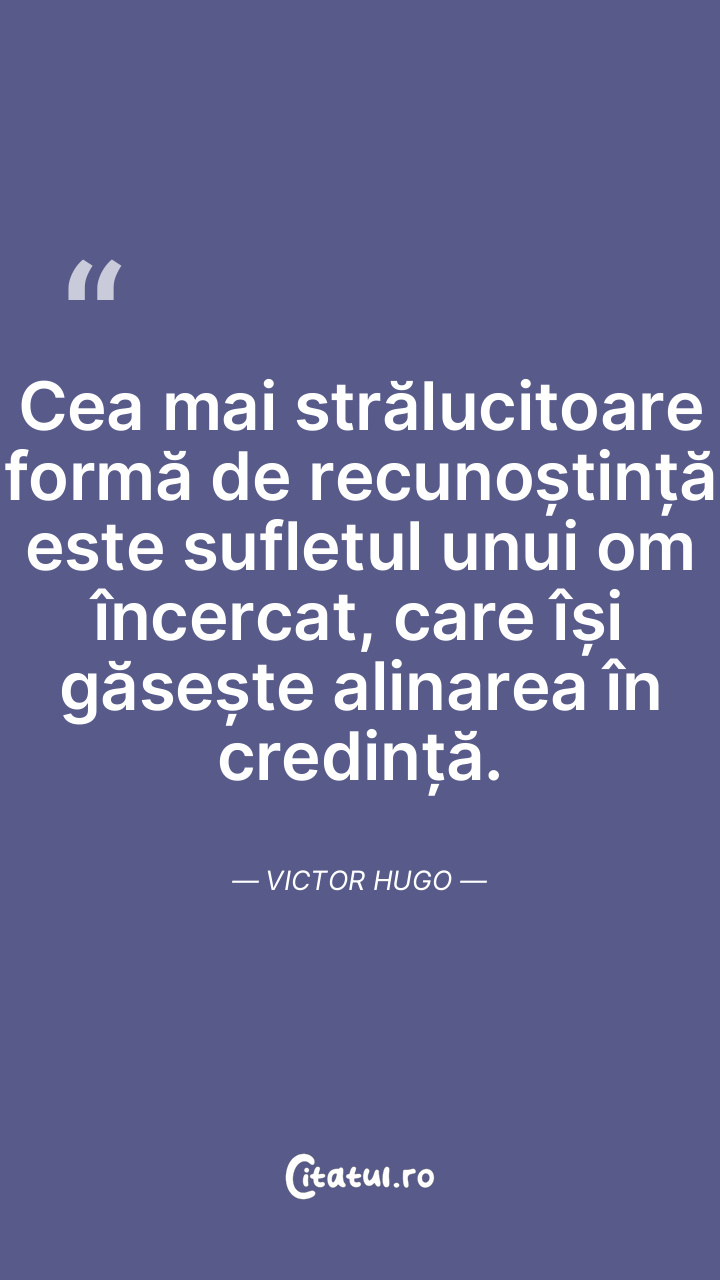 Cea mai strălucitoare formă de recunoștință este sufletul unui om încercat, care își găsește alinarea în credință. Victor Hugo