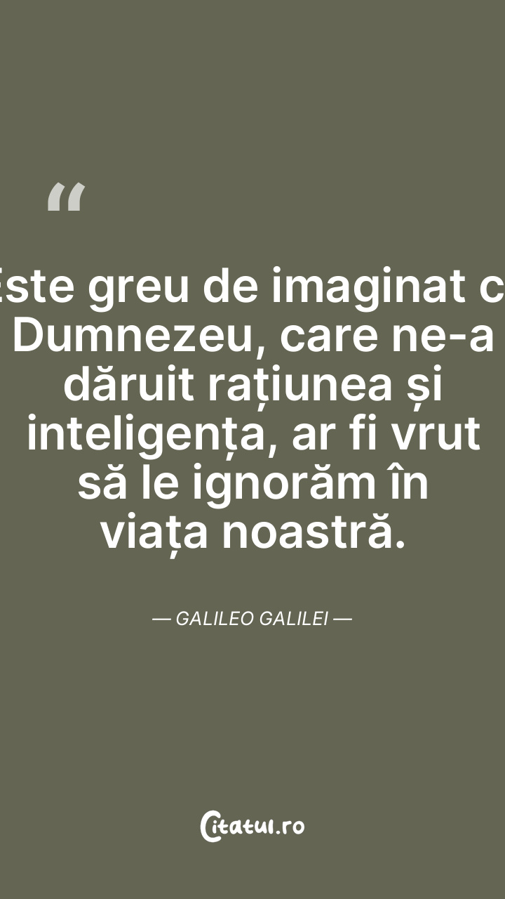 Este greu de imaginat că Dumnezeu, care ne-a dăruit rațiunea și inteligența, ar fi vrut să le ignorăm în viața noastră. Galileo Galilei