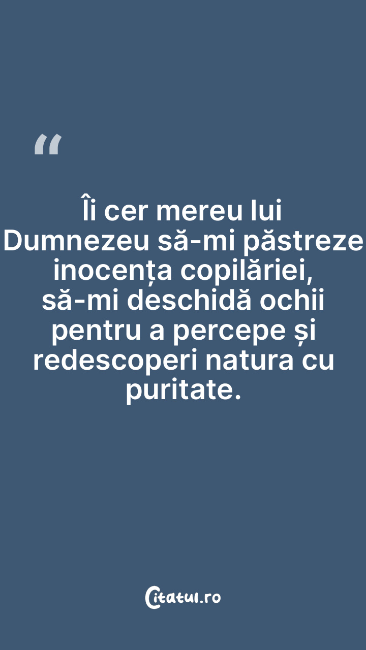 Îi cer mereu lui Dumnezeu să-mi păstreze inocența copilăriei, să-mi deschidă ochii pentru a percepe și redescoperi natura cu puritate.