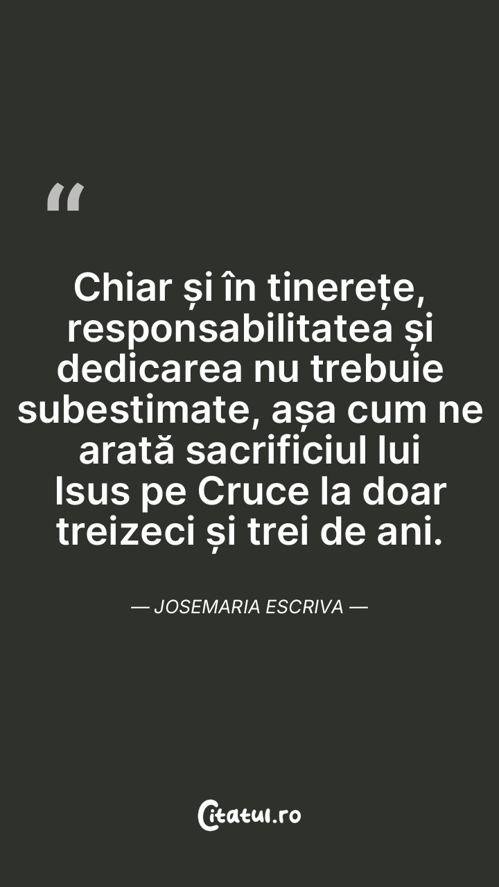 Chiar și în tinerețe, responsabilitatea și dedicarea nu trebuie subestimate, așa cum ne arată sacrificiul lui Isus pe Cruce la doar treizeci și trei de ani. Josemaria Escriva