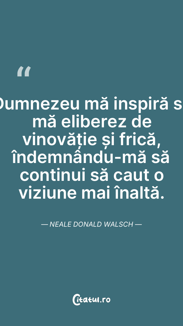Dumnezeu mă inspiră să mă eliberez de vinovăție și frică, îndemnându-mă să continui să caut o viziune mai înaltă. Neale Donald Walsch