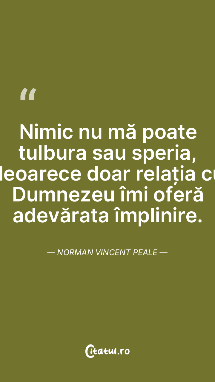 Nimic nu mă poate tulbura sau speria, deoarece doar relația cu Dumnezeu îmi oferă adevărata împlinire. Norman Vincent Peale