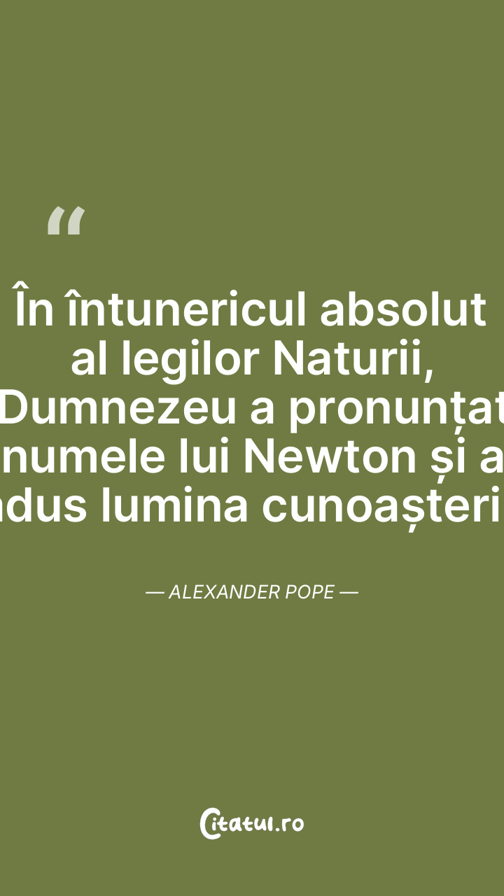 În întunericul absolut al legilor Naturii, Dumnezeu a pronunțat numele lui Newton și a adus lumina cunoașterii. Alexander Pope