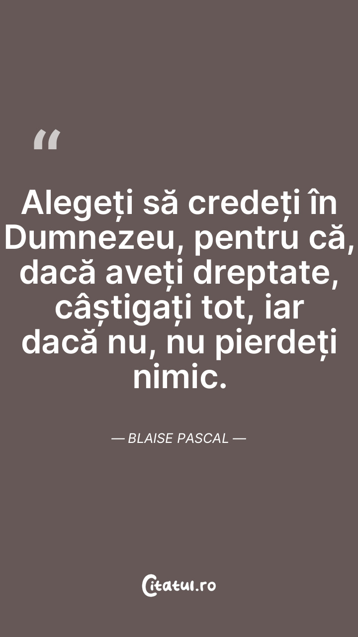 Alegeți să credeți în Dumnezeu, pentru că, dacă aveți dreptate, câștigați tot, iar dacă nu, nu pierdeți nimic. Blaise Pascal