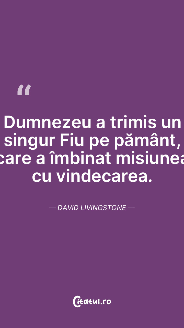 Dumnezeu a trimis un singur Fiu pe pământ, care a îmbinat misiunea cu vindecarea. David Livingstone