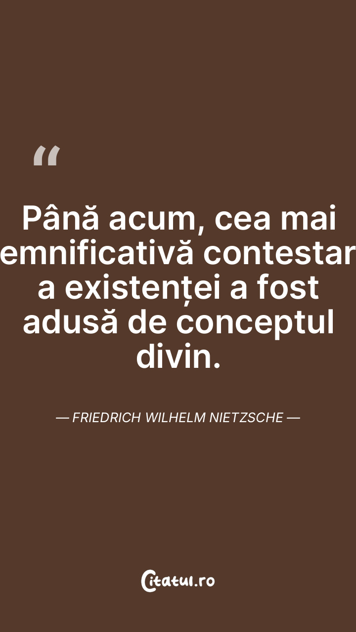 Până acum, cea mai semnificativă contestare a existenței a fost adusă de conceptul divin. Friedrich Wilhelm Nietzsche