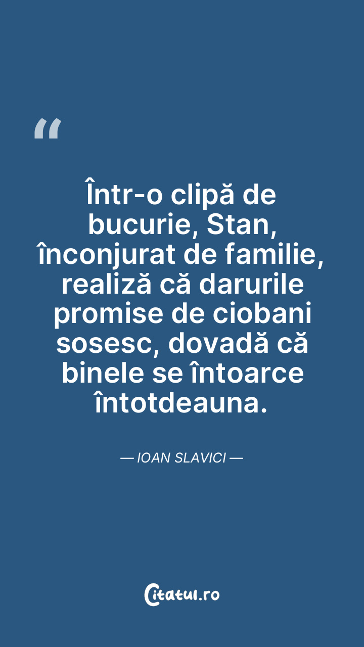 Într-o clipă de bucurie, Stan, înconjurat de familie, realiză că darurile promise de ciobani sosesc, dovadă că binele se întoarce întotdeauna. Ioan Slavici