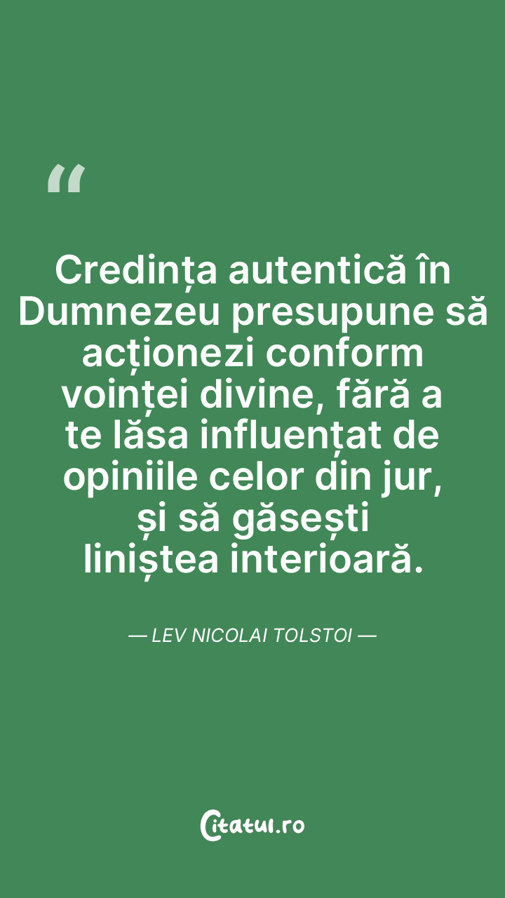 Credința autentică în Dumnezeu presupune să acționezi conform voinței divine, fără a te lăsa influențat de opiniile celor din jur, și să găsești liniștea interioară. Lev Nicolai Tolstoi