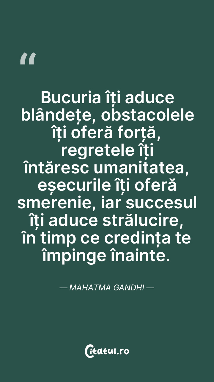 Bucuria îți aduce blândețe, obstacolele îți oferă forță, regretele îți întăresc umanitatea, eșecurile îți oferă smerenie, iar succesul îți aduce strălucire, în timp ce credința te împinge înainte. Mahatma Gandhi