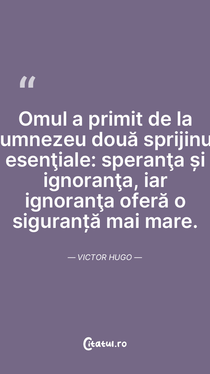 Omul a primit de la Dumnezeu două sprijinuri esenţiale: speranţa și ignoranţa, iar ignoranţa oferă o siguranță mai mare. Victor Hugo