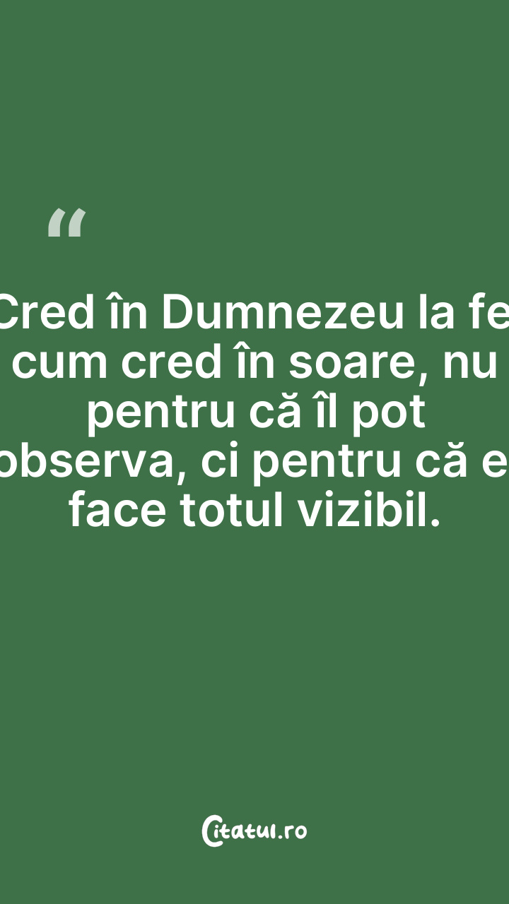 Cred în Dumnezeu la fel cum cred în soare, nu pentru că îl pot observa, ci pentru că el face totul vizibil.