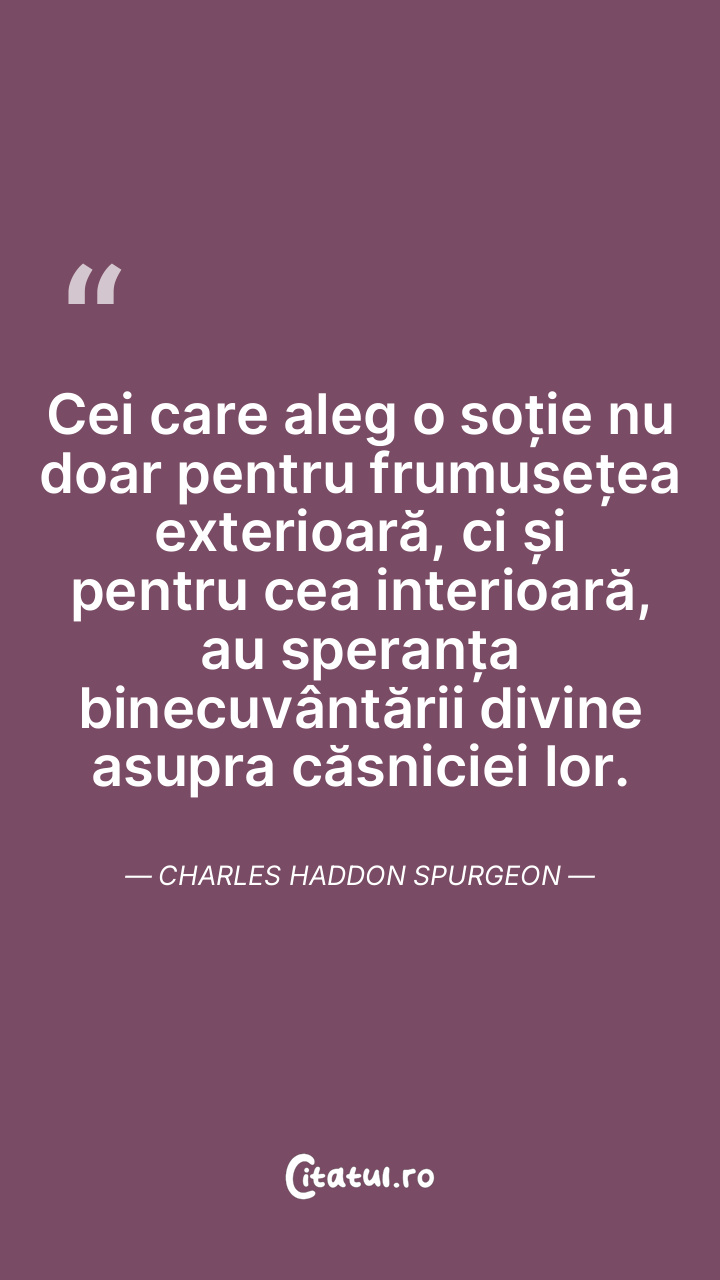 Cei care aleg o soție nu doar pentru frumusețea exterioară, ci și pentru cea interioară, au speranța binecuvântării divine asupra căsniciei lor. Charles Haddon Spurgeon