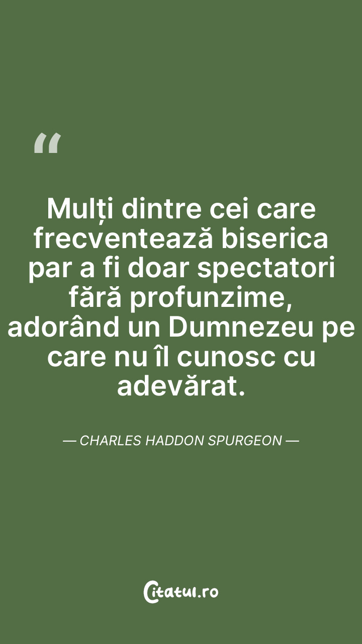 Mulți dintre cei care frecventează biserica par a fi doar spectatori fără profunzime, adorând un Dumnezeu pe care nu îl cunosc cu adevărat. Charles Haddon Spurgeon