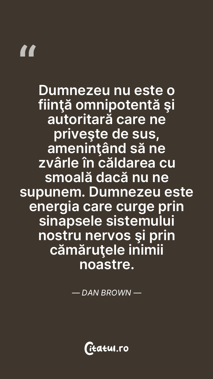 Dumnezeu nu este o fiinţă omnipotentă şi autoritară care ne priveşte de sus, ameninţând să ne zvârle în căldarea cu smoală dacă nu ne supunem. Dumnezeu este energia care curge prin sinapsele sistemului nostru nervos şi prin cămăruţele inimii noastre. Dan Brown