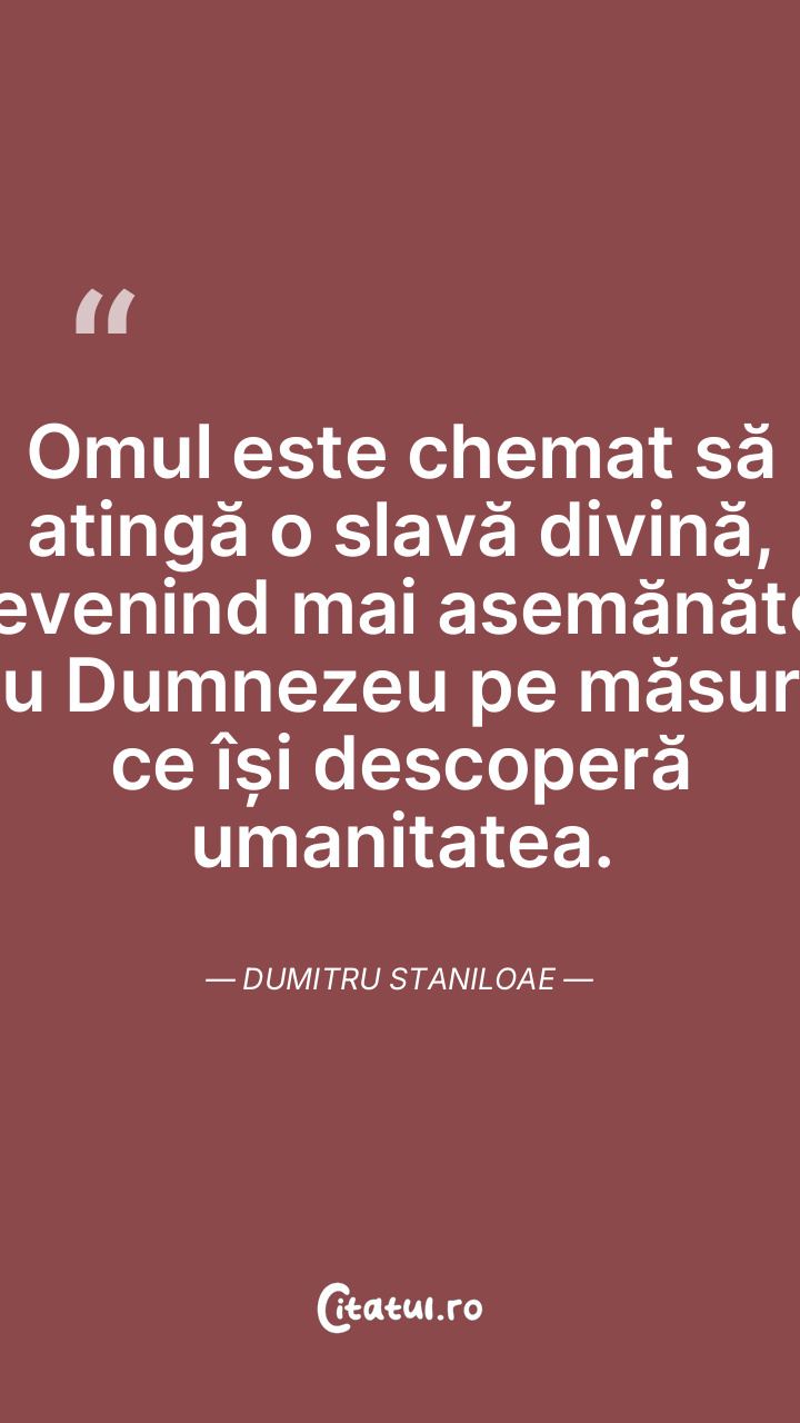 Omul este chemat să atingă o slavă divină, devenind mai asemănător cu Dumnezeu pe măsură ce își descoperă umanitatea. Dumitru Staniloae