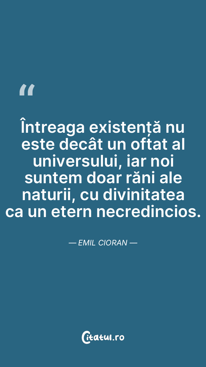 Întreaga existență nu este decât un oftat al universului, iar noi suntem doar răni ale naturii, cu divinitatea ca un etern necredincios. Emil Cioran