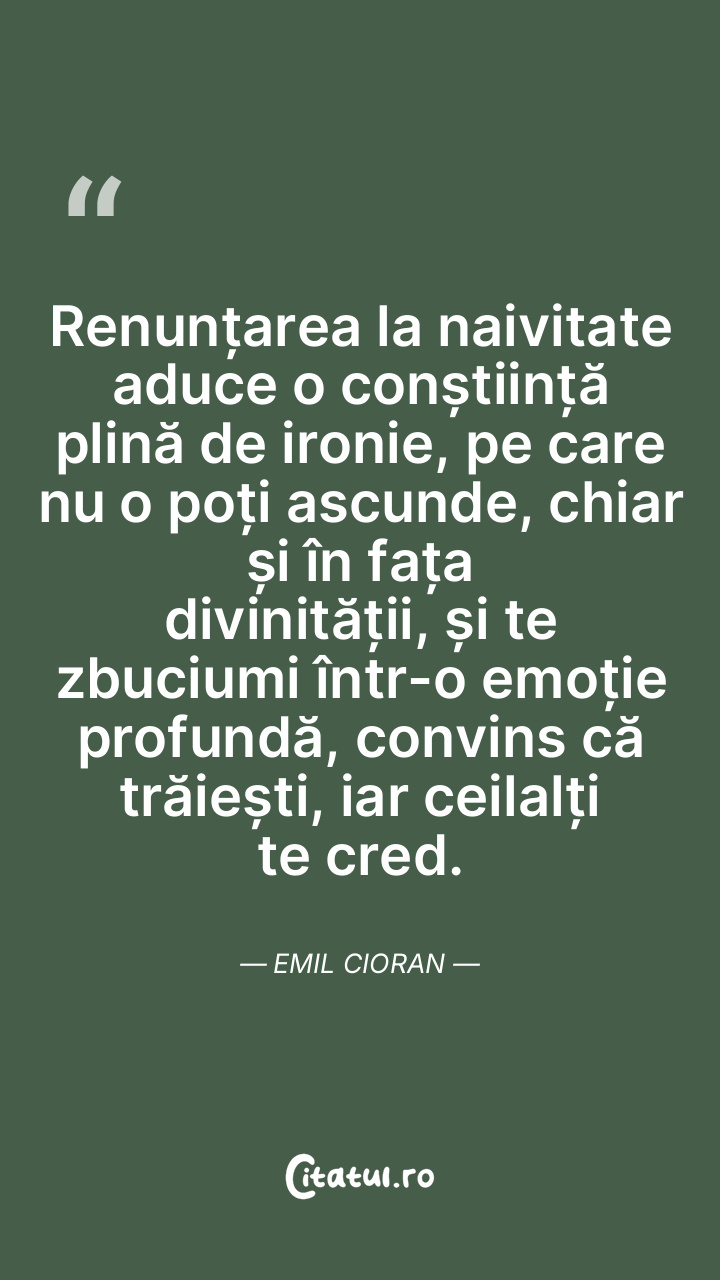 Renunțarea la naivitate aduce o conștiință plină de ironie, pe care nu o poți ascunde, chiar și în fața divinității, și te zbuciumi într-o emoție profundă, convins că trăiești, iar ceilalți te cred. Emil Cioran