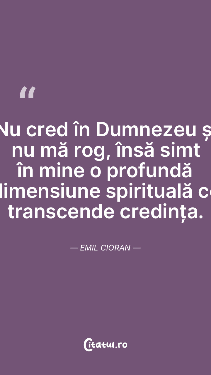 Nu cred în Dumnezeu și nu mă rog, însă simt în mine o profundă dimensiune spirituală ce transcende credința. Emil Cioran
