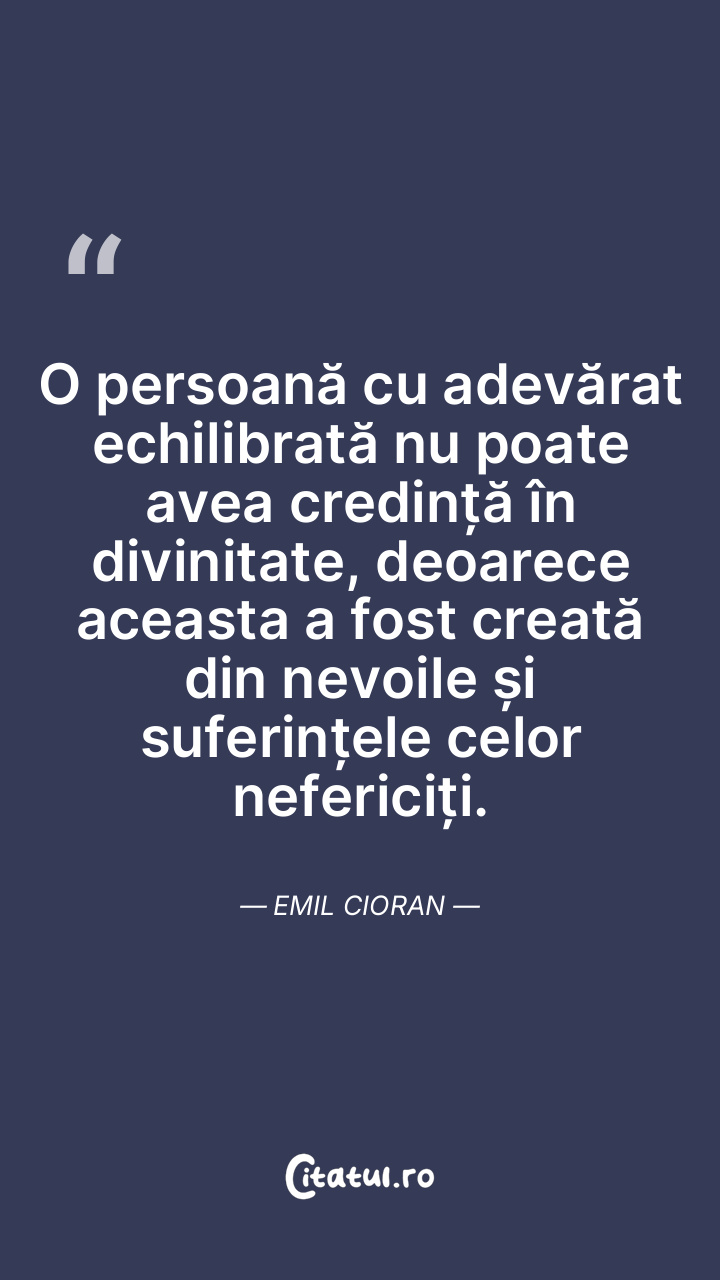 O persoană cu adevărat echilibrată nu poate avea credință în divinitate, deoarece aceasta a fost creată din nevoile și suferințele celor nefericiți. Emil Cioran