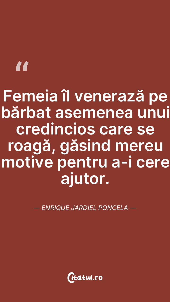 Femeia îl venerază pe bărbat asemenea unui credincios care se roagă, găsind mereu motive pentru a-i cere ajutor. Enrique Jardiel Poncela