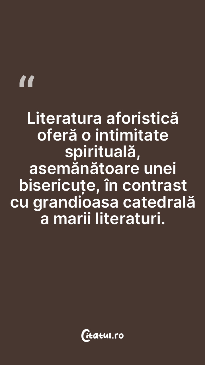 Literatura aforistică oferă o intimitate spirituală, asemănătoare unei bisericuțe, în contrast cu grandioasa catedrală a marii literaturi.