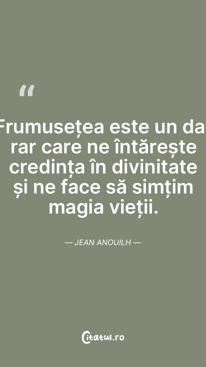 Frumusețea este un dar rar care ne întărește credința în divinitate și ne face să simțim magia vieții. Jean Anouilh