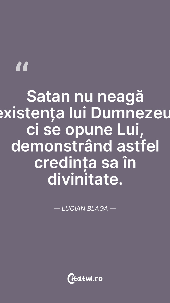 Satan nu neagă existența lui Dumnezeu, ci se opune Lui, demonstrând astfel credința sa în divinitate. Lucian Blaga