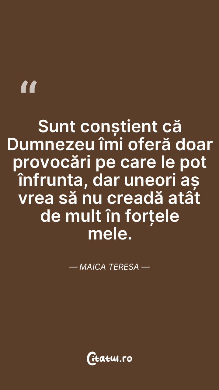 Sunt conștient că Dumnezeu îmi oferă doar provocări pe care le pot înfrunta, dar uneori aș vrea să nu creadă atât de mult în forțele mele. Maica Teresa