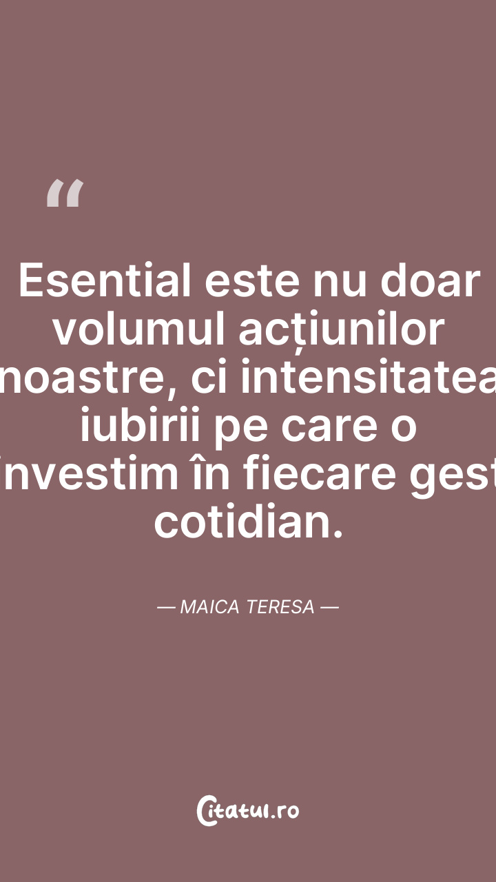 Esential este nu doar volumul acțiunilor noastre, ci intensitatea iubirii pe care o investim în fiecare gest cotidian. Maica Teresa
